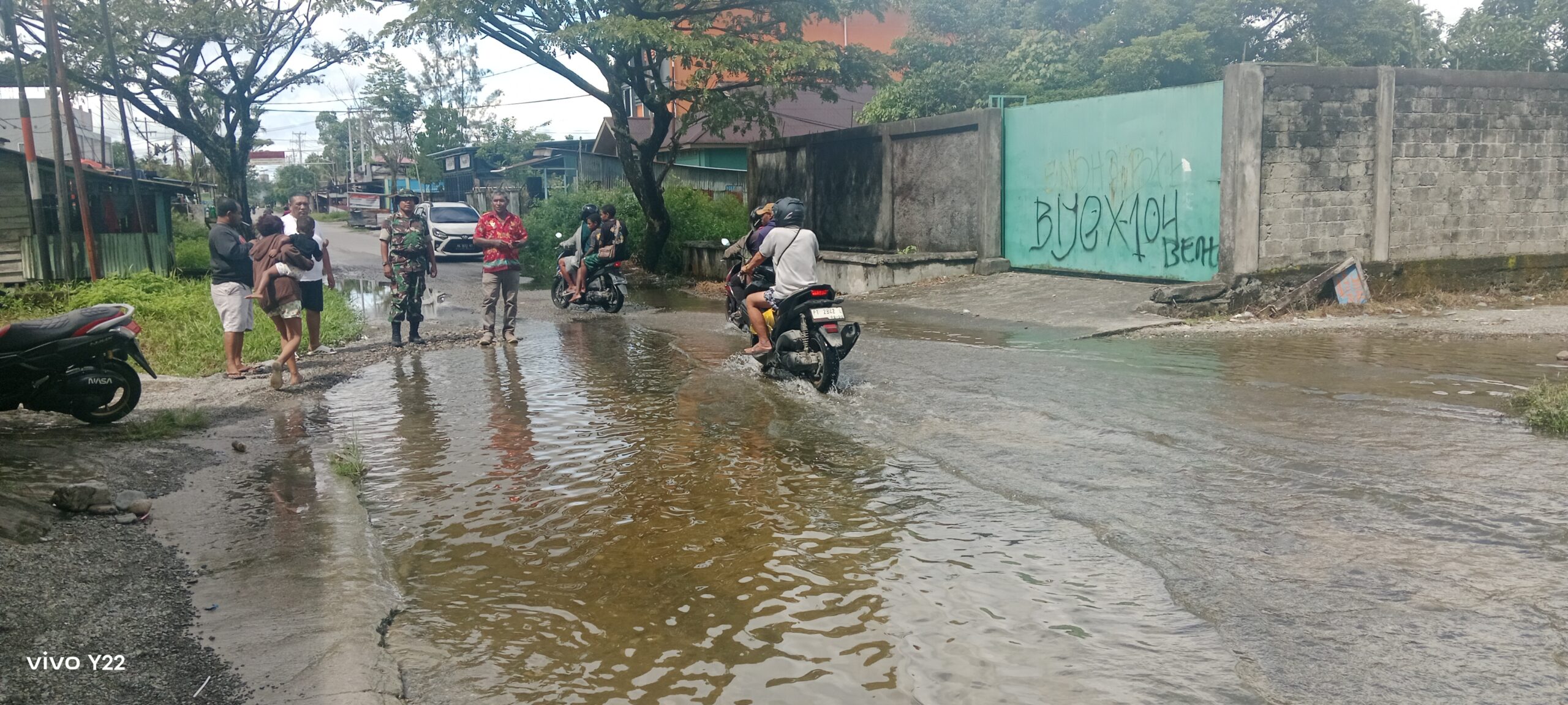 Pengendara roda dua saat melintasi jalan dengan kondisi jalan yang rusak dan tergenang air (foto: Riki Lodar/ Torangbisa.com)