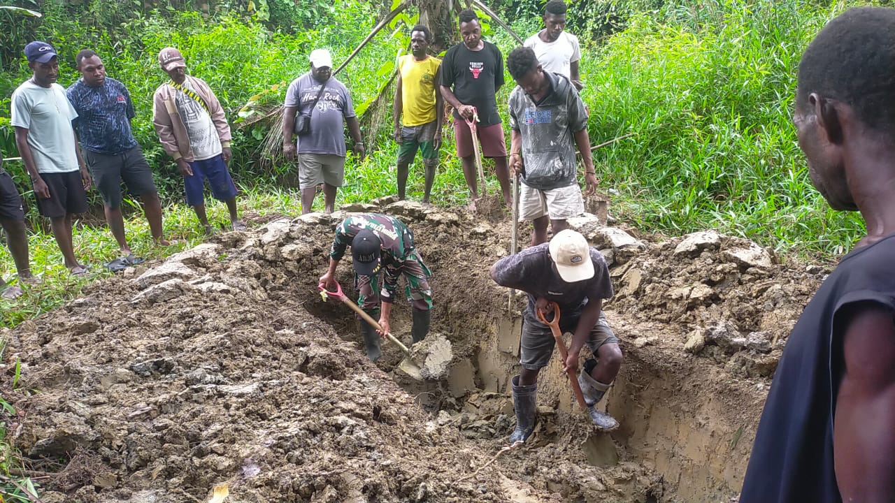 Timika, Torangbisa.com – Personel Satgas TMMD ke 124 Kodim 1710/Mimika dipimipin Serka Nurkholis bersama dengan warga setempat melaksanakan penggalian kuburan untuk tempat pemakaman Istri Kepala Kampung Pigapu yang meninggal Sabtu Dini hari kemarin.