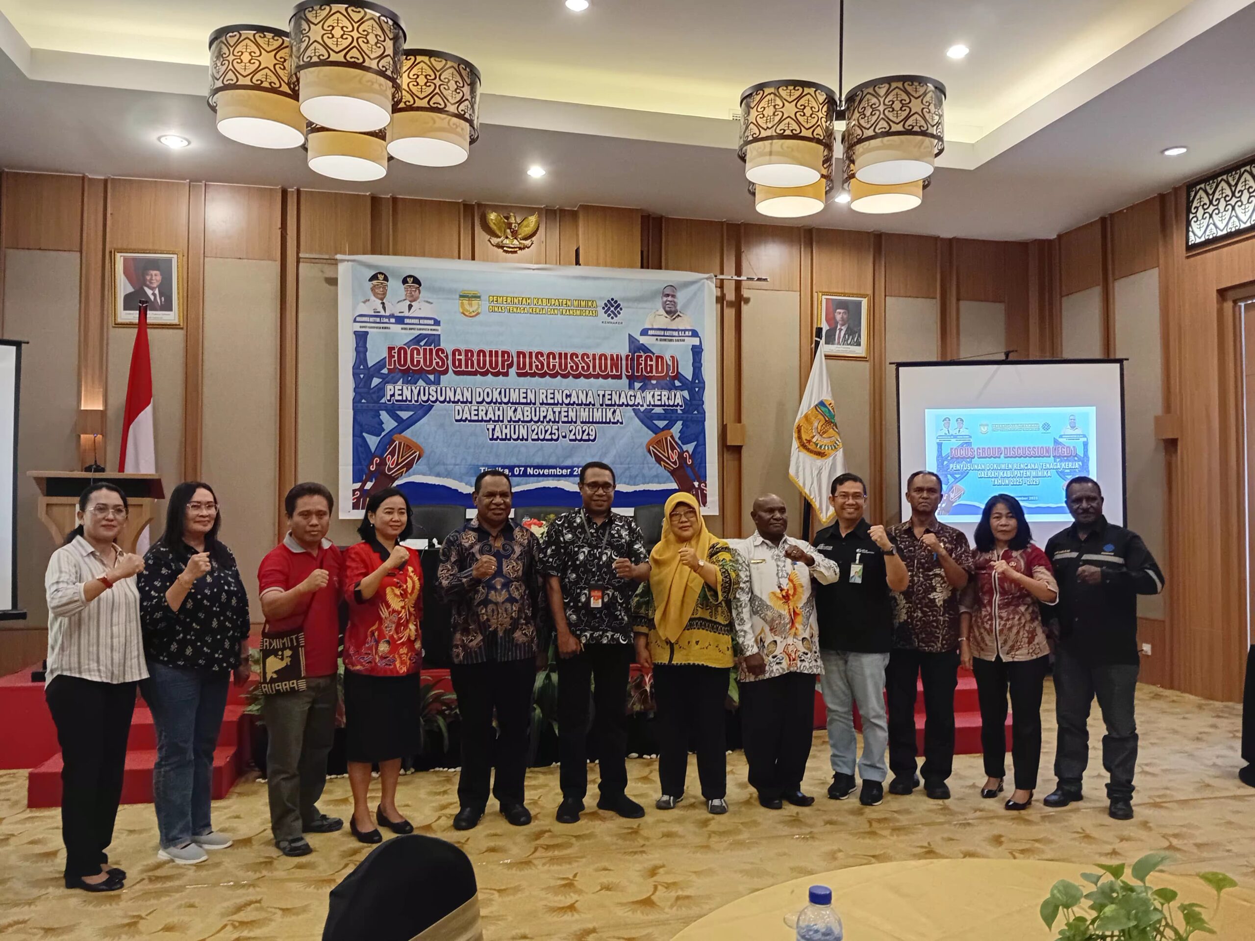 Kegiatan FGD ini juga dihadiri oleh Kepala Dinas Tenaga Kerja dan Transmigrasi Kabupaten Mimika beserta jajarannya, tenaga ahli dari Kementerian Ketenagakerjaan RI, serta pimpinan berbagai organisasi perangkat daerah.