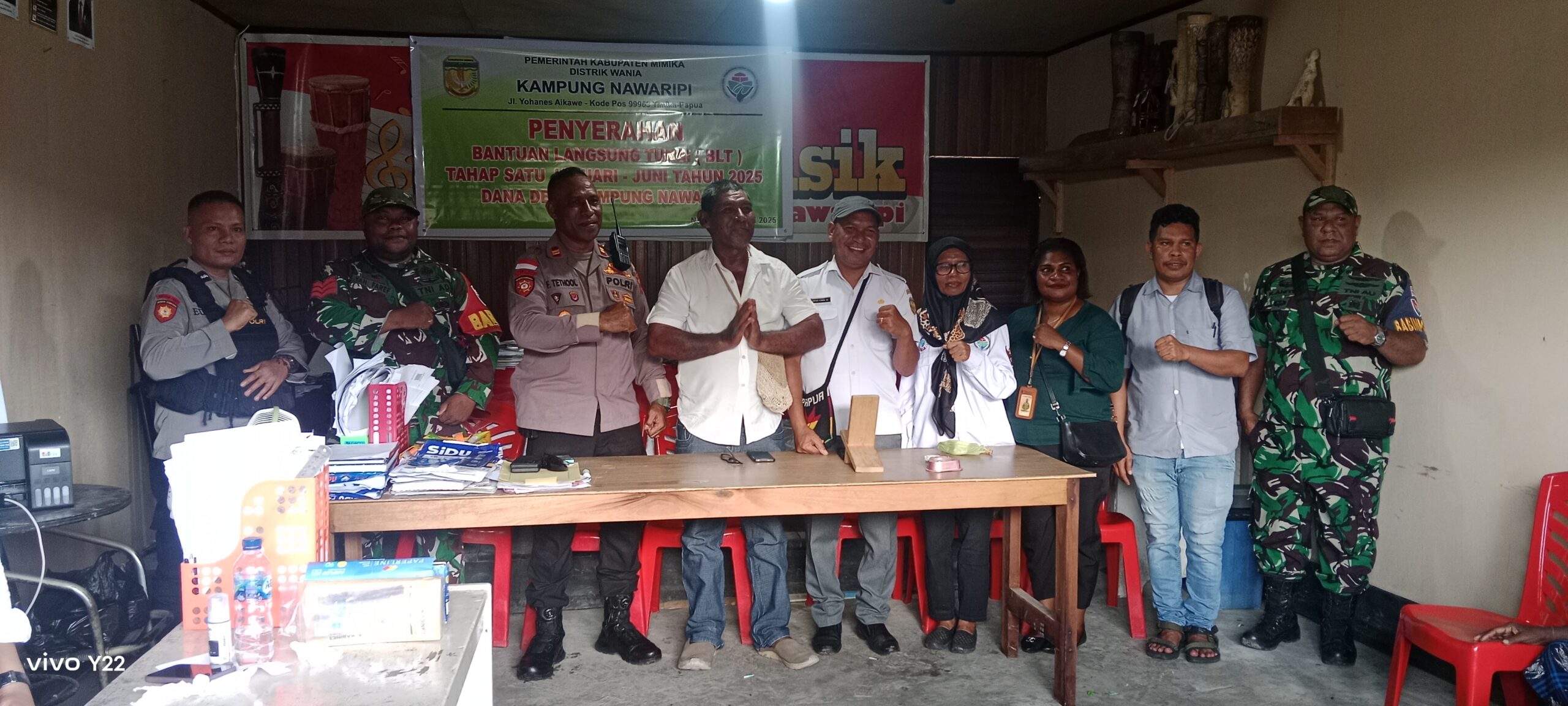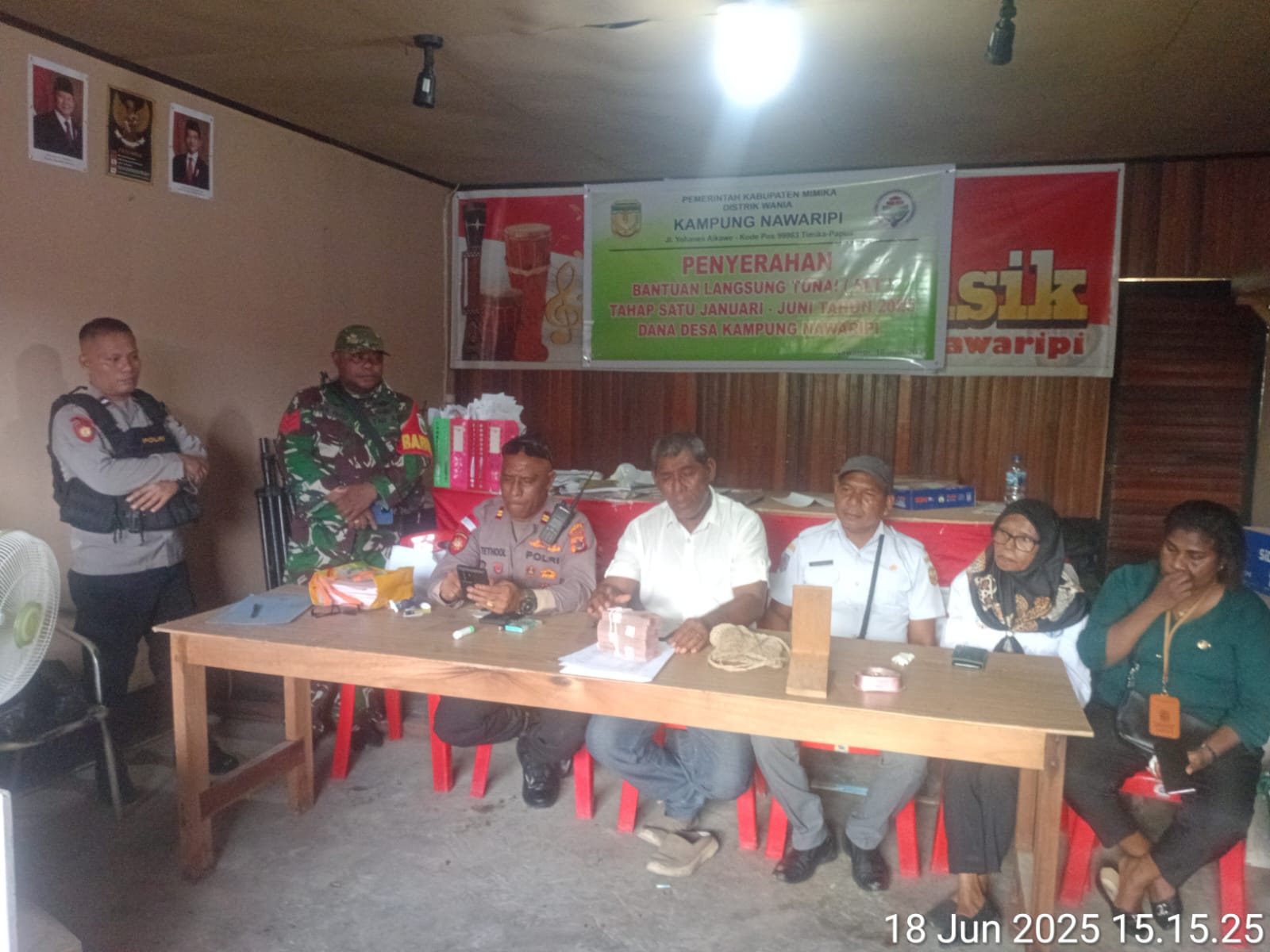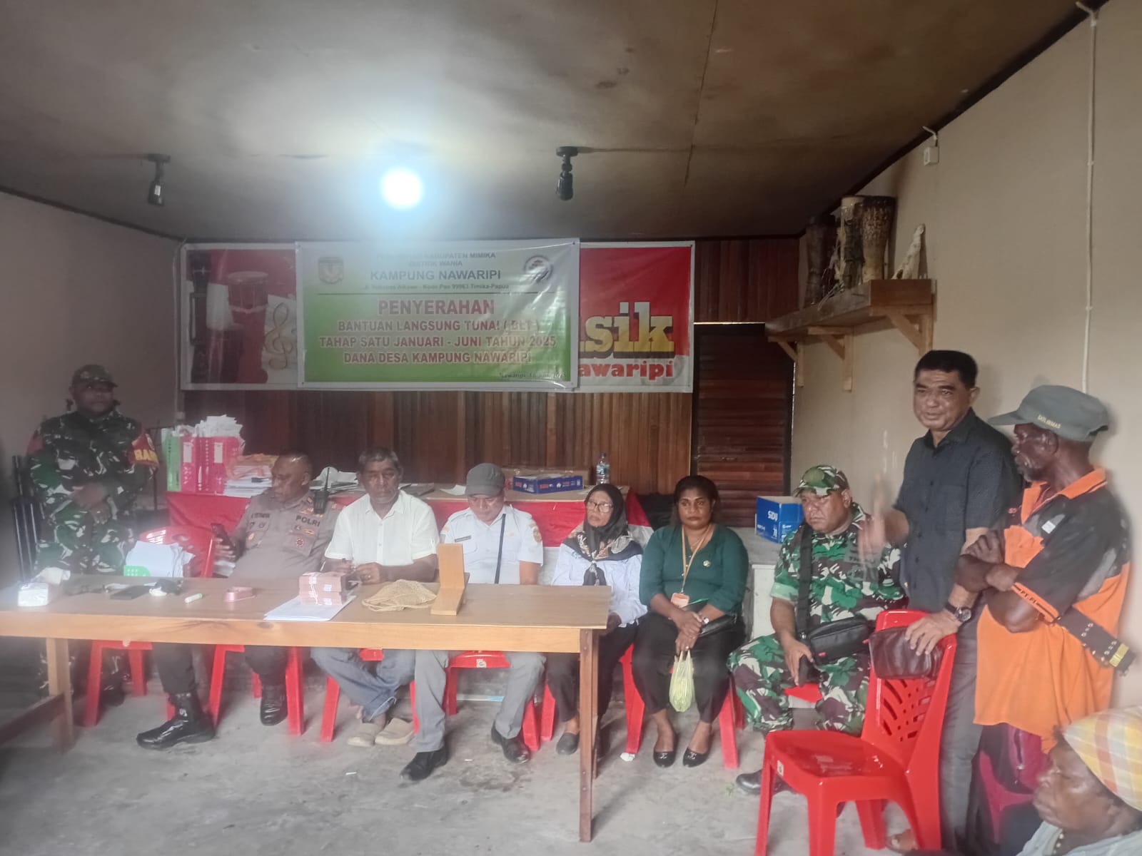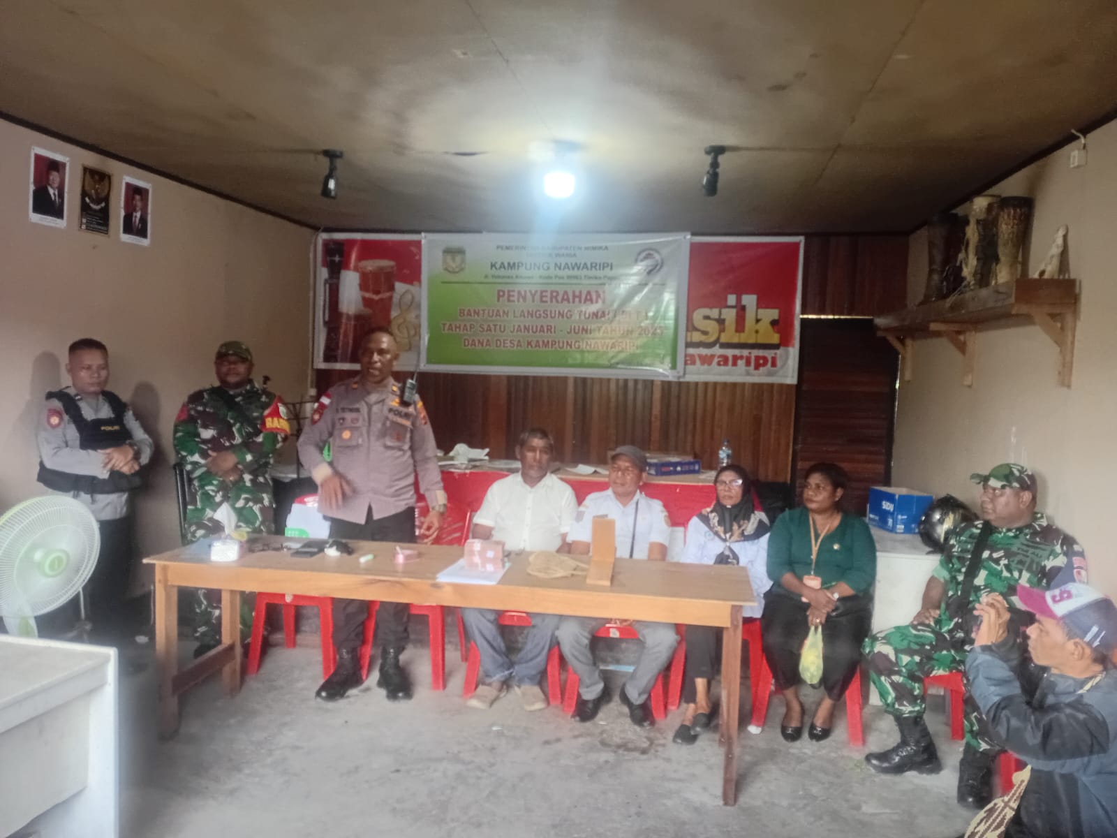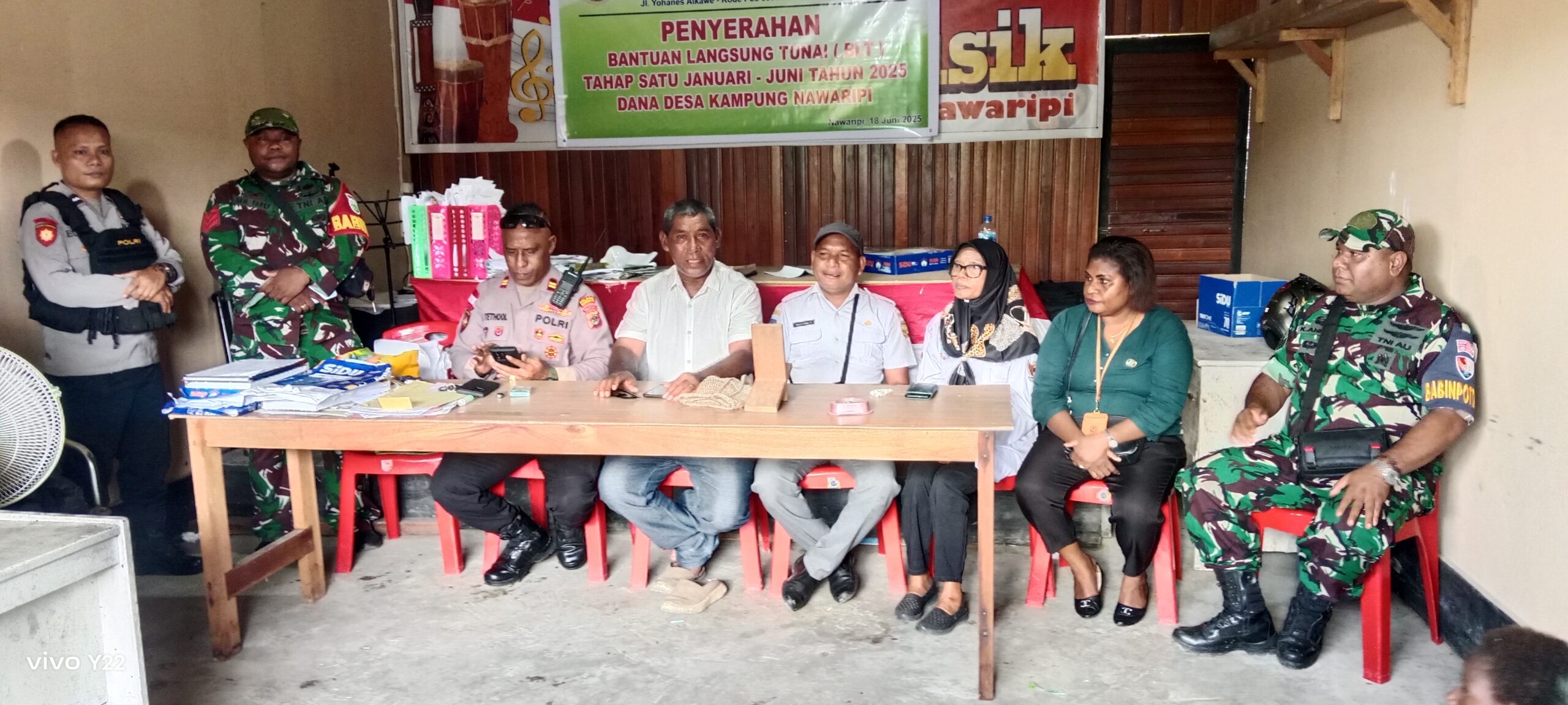 1. Kepala Kampung Nawaripi, Norman Ditubun didampingi Kasat Sabhara Polres Mimika, Iptu F Tethol, Perwakilan Distrik Wania, Pendamping Dana Desa, Siti Yauwarin, Babinsa Kopral Kepala Yan Faref, Babinpot Dirga Serka Kasmirus Anitu sebelum penyaluran BLT.