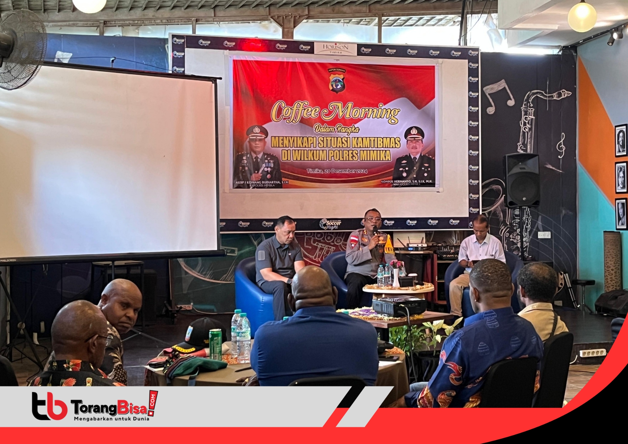 TIMIKA, (Torangbisa.com) – Dalam upaya menjaga keamanan dan ketertiban masyarakat (Kamtibmas) di wilayah hukum Polres Mimika, Kapolres Mimika AKBP I Komang Budiartha bersama jajarannya menggelar coffee morning dengan sejumlah tokoh masyarakat di Hotel Horison Hasanuddin, Timika, Jumat (20/12/2024).