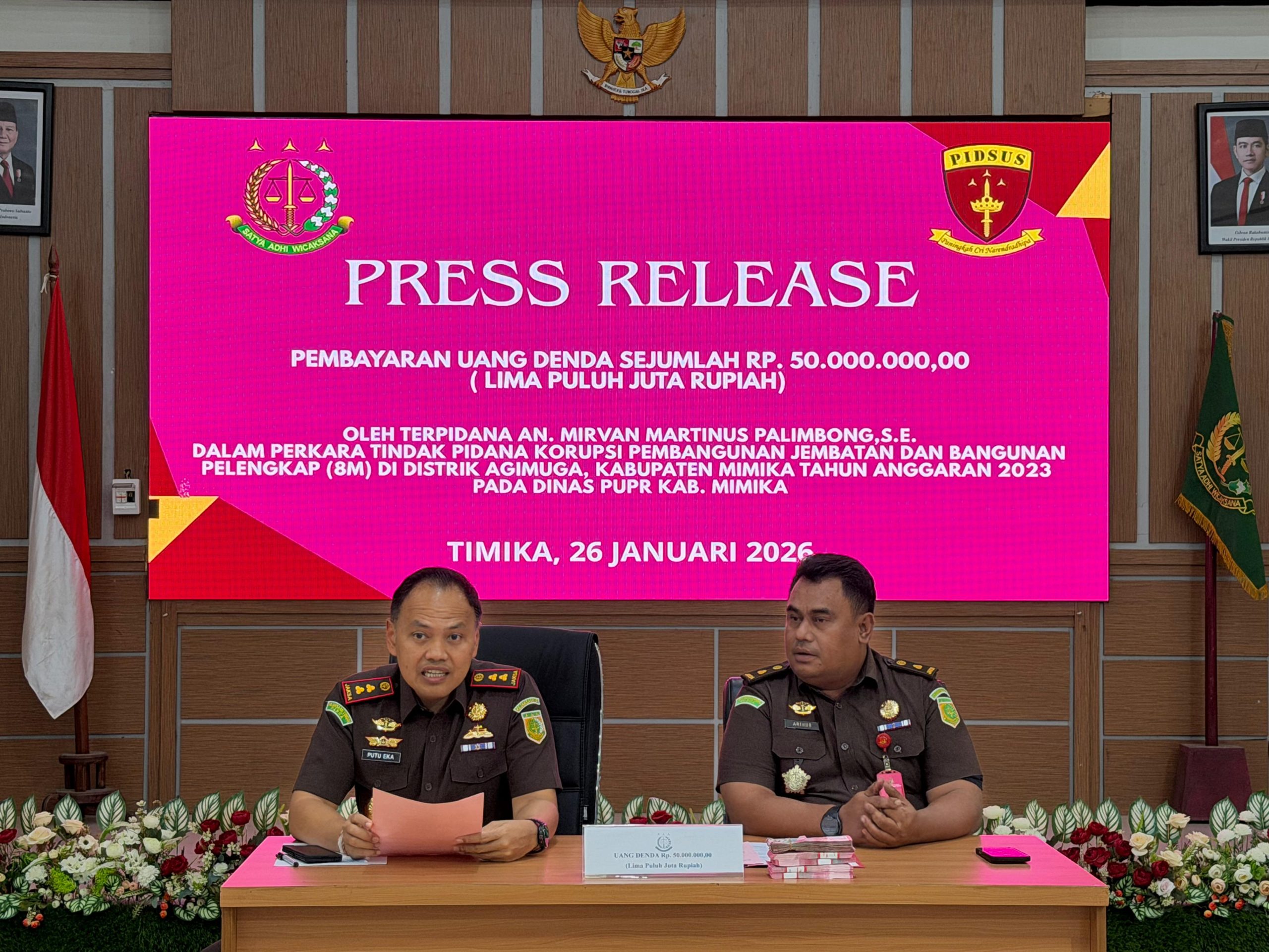 Uang denda tersebut merupakan pelaksanaan putusan pengadilan dalam perkara tindak pidana korupsi pada kegiatan Pembangunan Jembatan dan Bangunan Pelengkap sepanjang 8 meter di Distrik Agimuga, Dinas Pekerjaan Umum dan Penataan Ruang (PUPR) Kabupaten Mimika Tahun Anggaran 2023.
