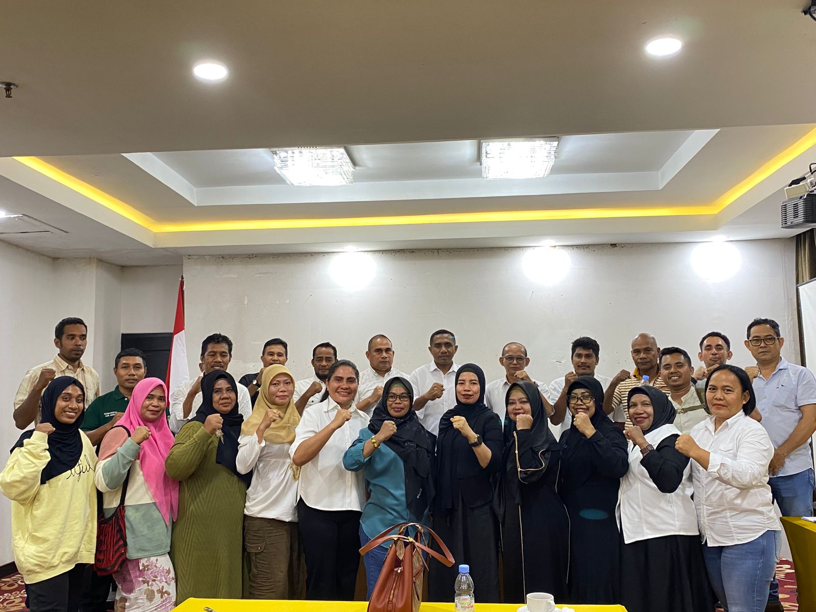 Plt Ketua KKMU Kabupaten Mimika, Hj. Rempeani Rachman dan Ketua Panitia Musda KKMU, William Kawang dan seluruh panitia serta perwakilan masing-masing pilar saat sesi foto bersama (Foto: Yani/ Torangbisa.com)