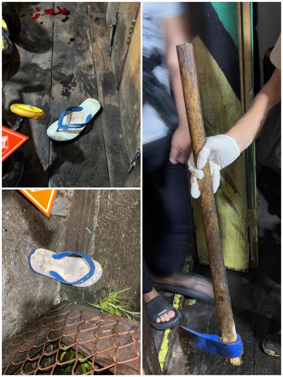 Di lokasi kejadian, aparat berhasil mengamankan barang bukti berupa satu buah kapak yang digunakan pelaku serta sepasang sandal berwarna putih biru.