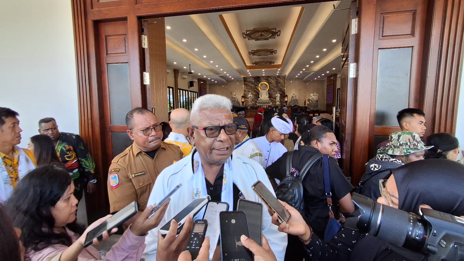 Bupati Mimika, Johannes Rettob saat diwawancarai usai penandatanganan prasasti di Vihara Bodhi Mandala (foto: Nando/ Torangbisa.com)